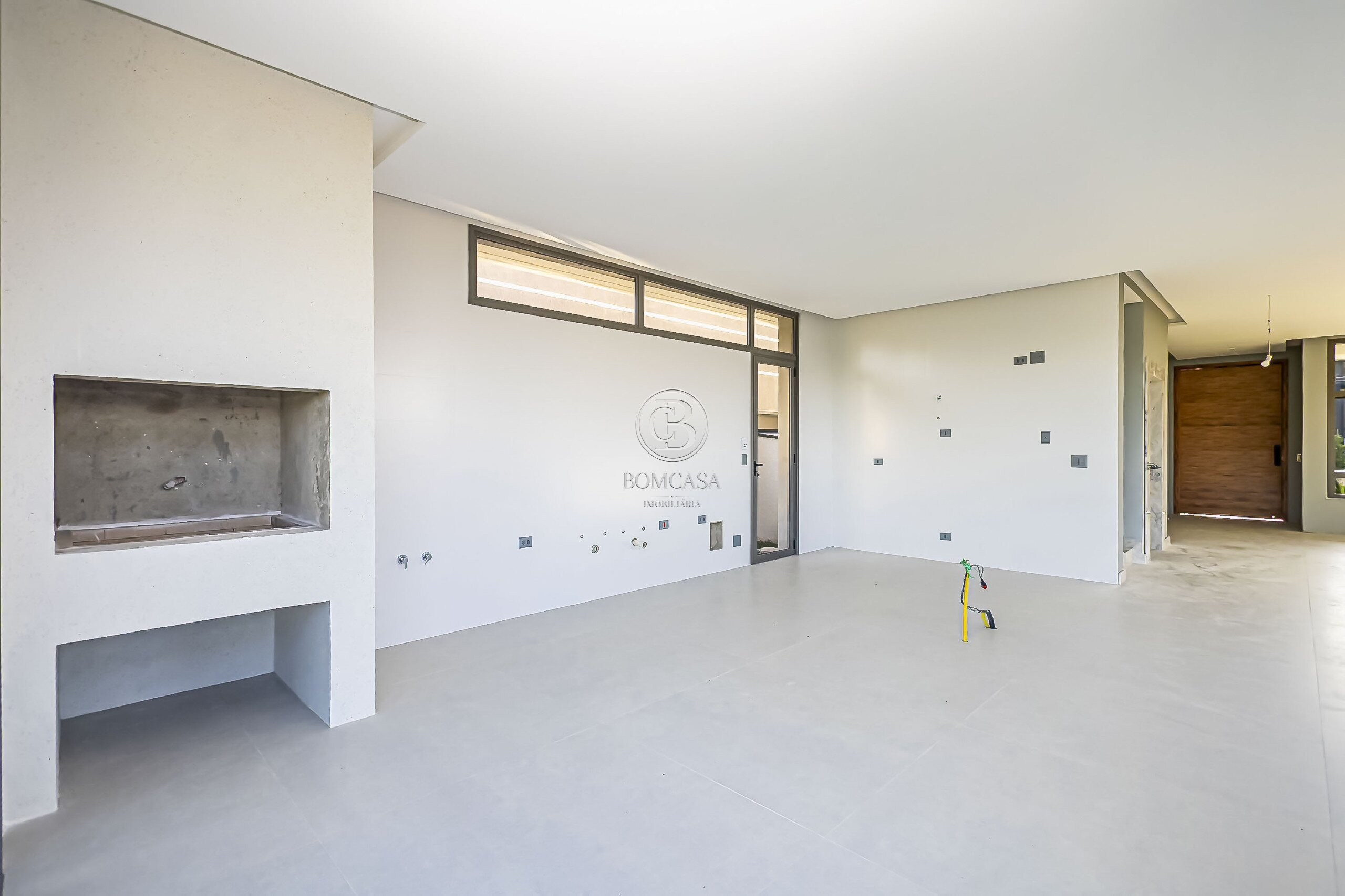 Sala ampla integrada à cozinha gourmet com churrasqueira
